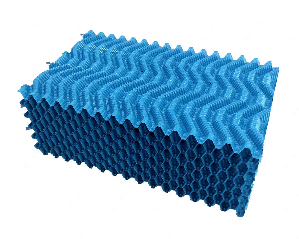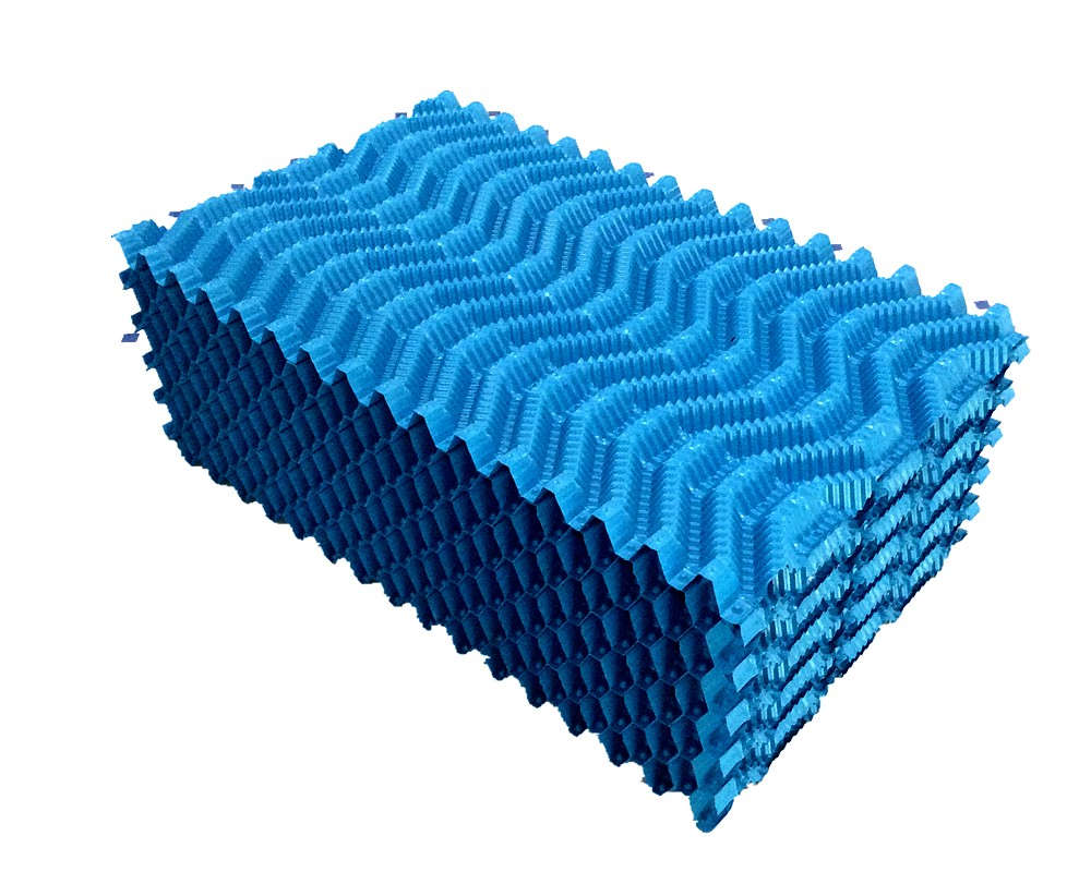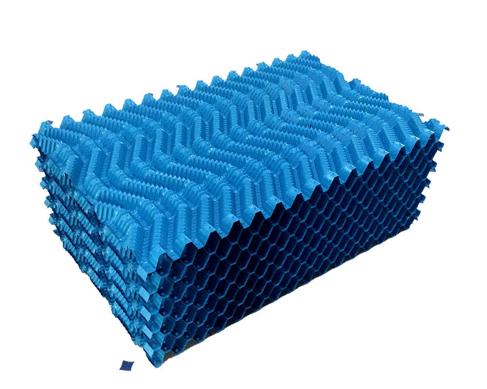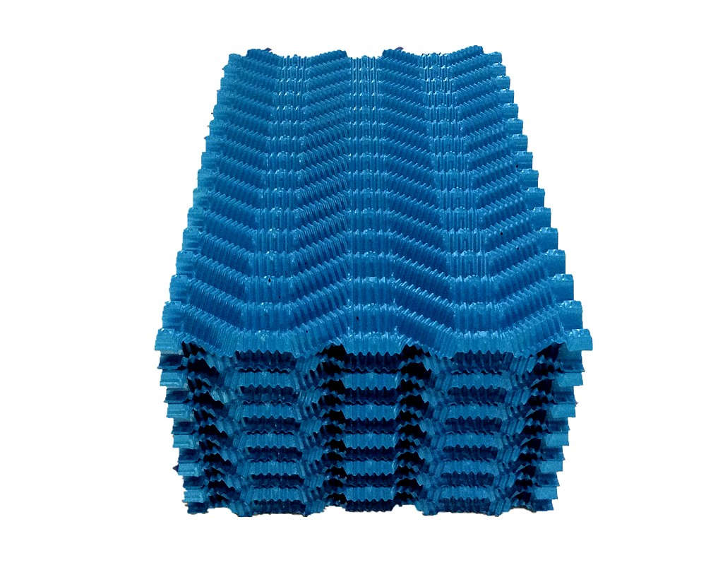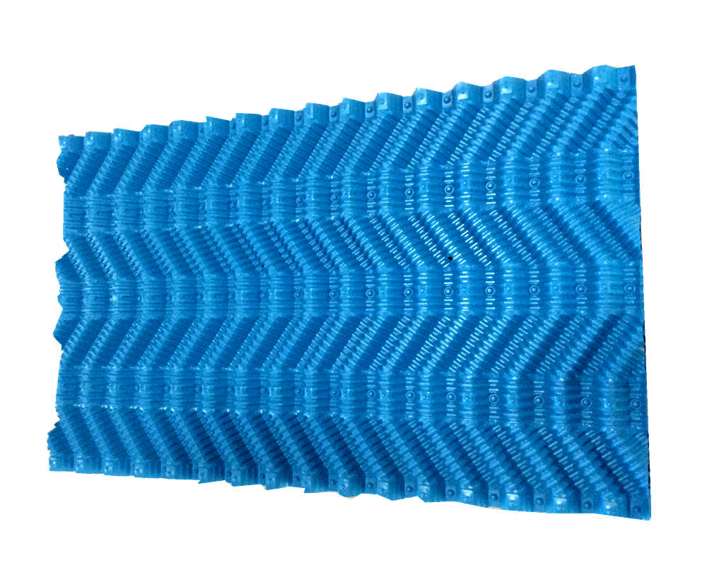 冷卻塔塔芯填料是由優(yōu)質PVC聚乙烯片正負壓及吸塑而成,主要采用了水紋波形、梯形波、點波形、S波型、人字波形填料,散熱面積增長系數大,水流在板面上分布性能好,水和空氣流經板面時擾動大等優(yōu)點。填料不易變形,耐高溫,抗老化,且阻燃性能好,風阻系數小。安裝方便,易清洗,運輸方便該散熱填料采用粘接式及懸掛式,安裝簡便,便于清洗,且成功解決了粘接填料因吸積垢、自重而產生變形,且變形后積垢更加嚴重、難于清洗的問題。填料阻燃性能好,阻燃氧指數指標為42.7,每立方米組裝體質量約為15 kg—30kg/m3,組裝高度為0.5m—3.0m,交錯布置,對于塔壁周邊異形塊可視現(xiàn)場布置情況,按實際尺寸切割、安裝。