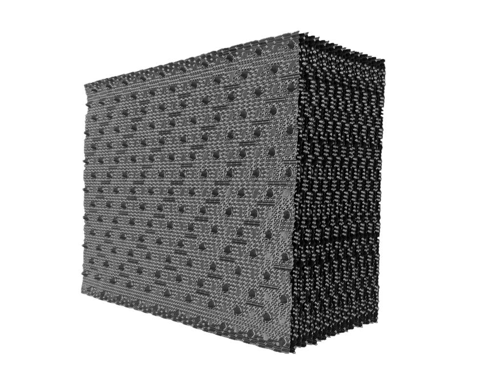 冷卻塔塔芯填料是由優(yōu)質(zhì)PVC聚乙烯片正負壓及吸塑而成,主要采用了水紋波形、梯形波、點波形、S波型、人字波形填料,散熱面積增長系數(shù)大,水流在板面上分布性能好,水和空氣流經(jīng)板面時擾動大等優(yōu)點。填料不易變形,耐高溫,抗老化,且阻燃性能好,風(fēng)阻系數(shù)小。安裝方便,易清洗,運輸方便該散熱填料采用粘接式及懸掛式,安裝簡便,便于清洗,且成功解決了粘接填料因吸積垢、自重而產(chǎn)生變形,且變形后積垢更加嚴重、難于清洗的問題。填料阻燃性能好,阻燃氧指數(shù)指標為42.7,每立方米組裝體質(zhì)量約為15 kg—30kg/m3,組裝高度為0.5m—3.0m,交錯布置,對于塔壁周邊異形塊可視現(xiàn)場布置情況,按實際尺寸切割、安裝。
